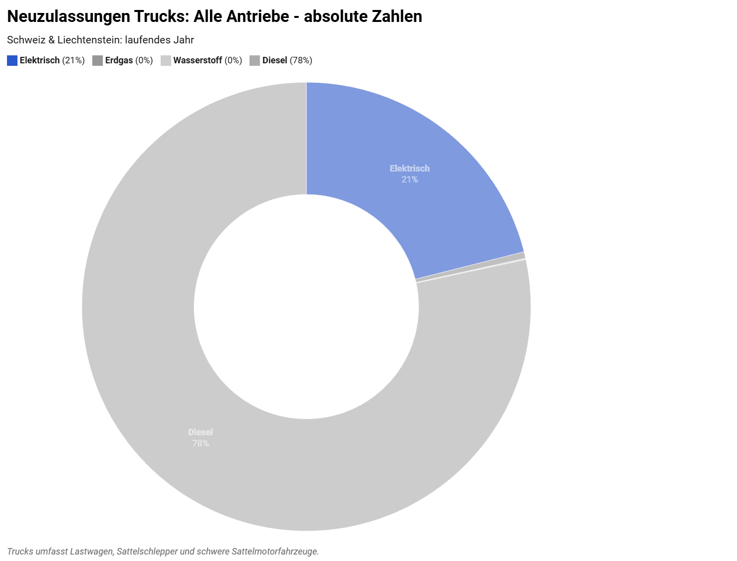 Bei den schweren Nutzfahrzeugen nimmt die Schweiz auch 2025 eine Spitzenposition in Europa ein. Mit einem Marktanteil von knapp 21 % bei elektrischen Lastwagen liegt sie vor Ländern wie Dänemark und Schweden. Diese Entwicklung ist insbesondere dem Engagement zukunftsorientierter Transportunternehmen zuzuschreiben. Gegen Jahresende nahm die Dynamik weiter zu: Im Dezember erreichten elektrische Lastwagen einen Marktanteil von 34.8 %. Die weitere Marktentwicklung wird wesentlich von der Ausgestaltung der leistungsabhängigen Schwerverkehrsabgabe abhängen.