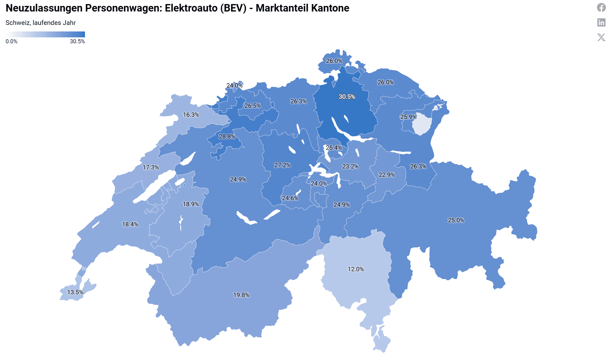 Bei der Elektrifizierung des Personenwagenmarktes bestehen weiterhin deutliche kantonale Unterschiede. Die Deutschschweiz weist die höchsten Anteile an Elektrofahrzeugen bei den Neuzulassungen auf, während andere Regionen deutlich zurückliegen. Diese Spannweite spiegelt unterschiedliche Nachfrageprofile sowie infrastrukturelle und regulatorische Rahmenbedingungen wider. Detaillierte kantonale Zahlen sind im Statistikportal von Swiss eMobility verfügbar.