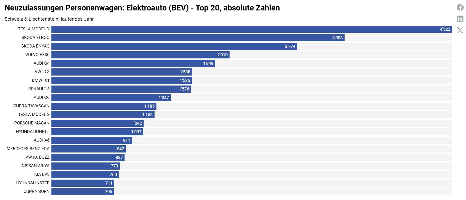 Wie bereits in den Vorjahren waren auch 2025 grosse elektrische SUVs und Crossover besonders gefragt. Das Tesla Model Y zählte erneut zu den meistverkauften Elektroautos der Schweiz. Ebenfalls hohe Verkaufszahlen verzeichneten Modelle wie der Škoda Elroq und Enyaq. Die breite Modellpalette stärkt die Akzeptanz bei den Kundinnen und Kunden und zeigt, dass das Angebot an Elektrofahrzeugen weiter an Reife gewonnen hat. Auf Markenebene löste Škoda Tesla als meistverkaufte Elektromarke ab.